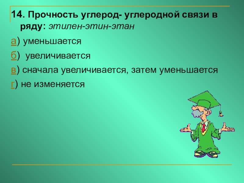 Слайд 1614. Прочность углерод- углеродной связи в ряду: этилен-этин-этан
