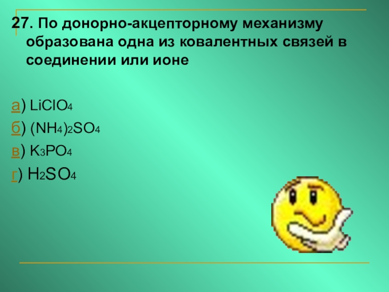 Слайд 2927. По донорно-акцепторному механизму образована одна из ковалентных связей в соединении