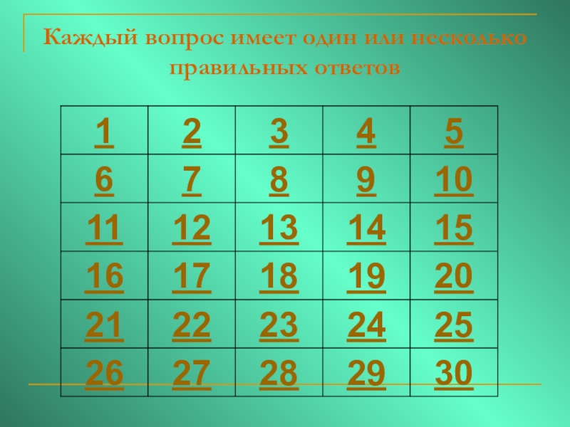 Слайд 2Каждый вопрос имеет один или несколько правильных ответов