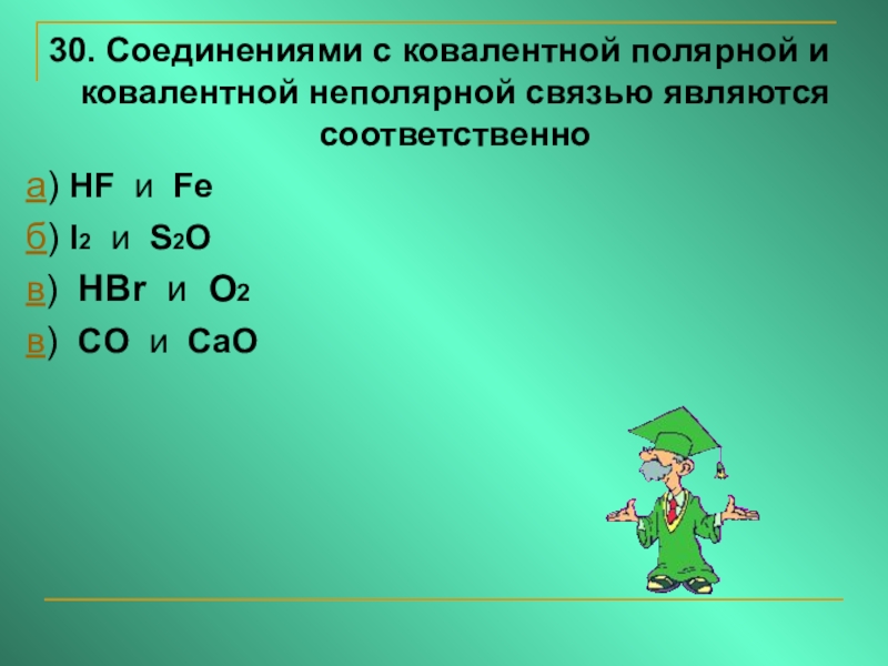 Слайд 3230. Соединениями с ковалентной полярной и ковалентной неполярной связью являются соответственно