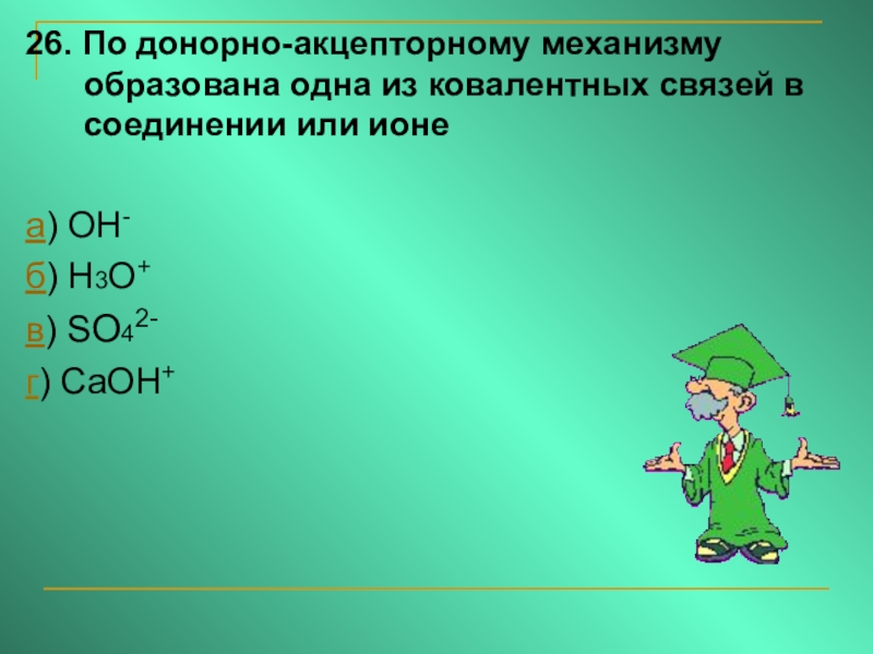 Слайд 2826. По донорно-акцепторному механизму образована одна из ковалентных связей в соединении