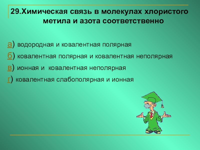 Слайд 3129.Химическая связь в молекулах хлористого метила и азота соответственно