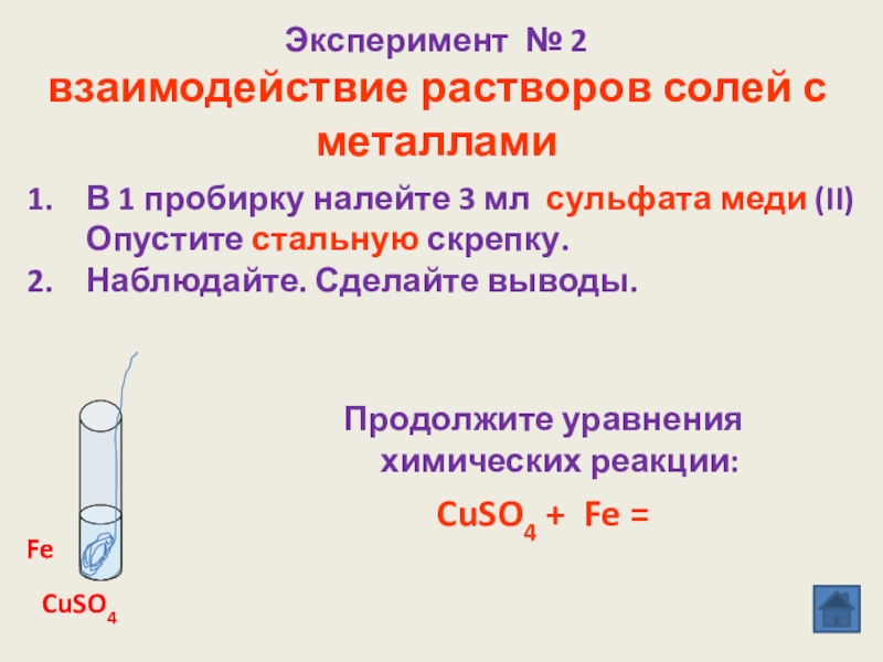 В 1 пробирку налейте 3 мл сульфата меди (II) Опустите стальную скрепку.
