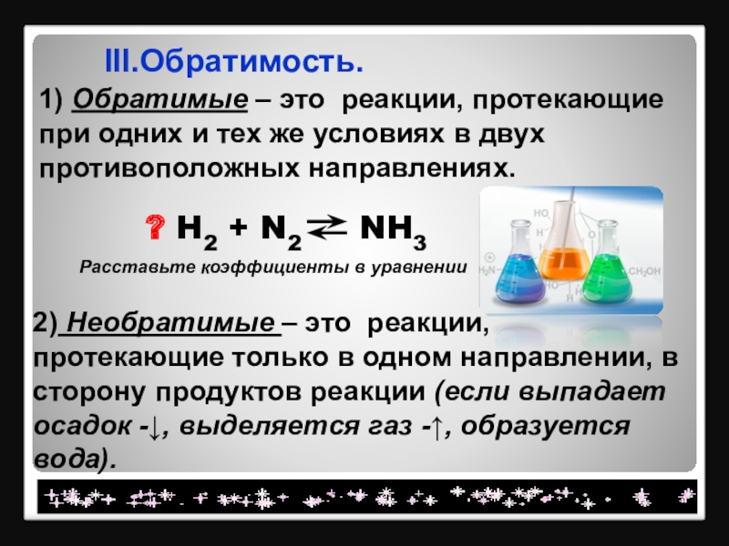 2) Необратимые – это реакции, протекающие только в одном направлении, в сторону продуктов реакции (если выпадает осадок -↓, выделяется газ -↑, образуется вода).