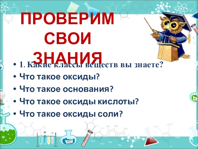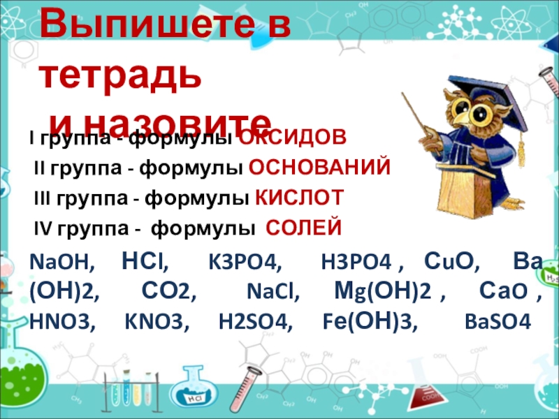 NaOH, НСl, K3PO4, H3PO4 , СuО, Ва(ОН)2, СО2, NaCl, Мg(ОН)2 , СаO , HNO3, KNO3, H2SO4, Fе(ОН)3, BaSO4