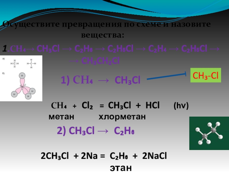 1.CH₄→ CH₃Cl → C₂H₆ → C₂H₅Cl → C₂H₄ → C₂H₅Cl →