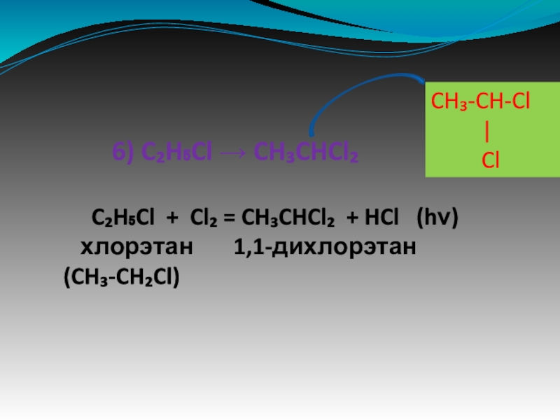 1) CH₃- CH ₃ + Cl₂ → CH₃-CH₂Cl + HCl (hν)