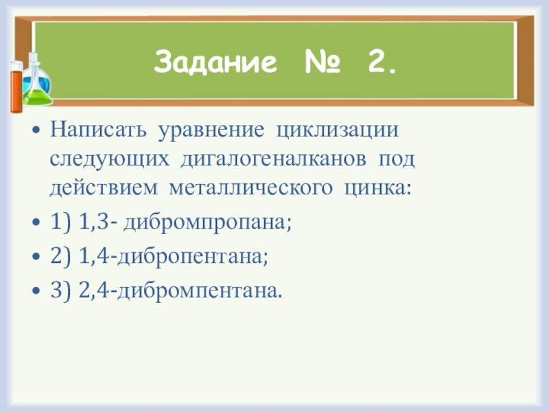 Задание № 2.Написать уравнение циклизации следующих дигалогеналканов под действием металлического цинка:1) 1,3- дибромпропана;2) 1,4-дибропентана;3) 2,4-дибромпентана.