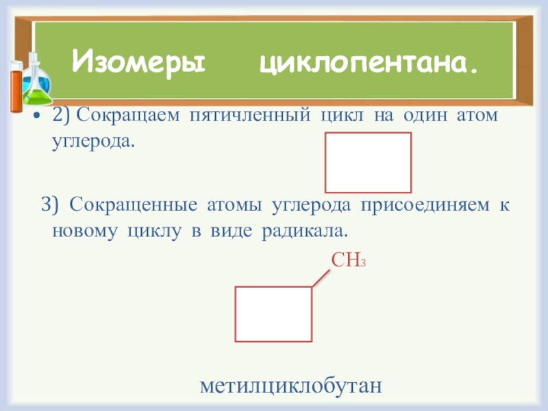 Изомеры  циклопентана.2) Сокращаем пятичленный цикл на один атом углерода.