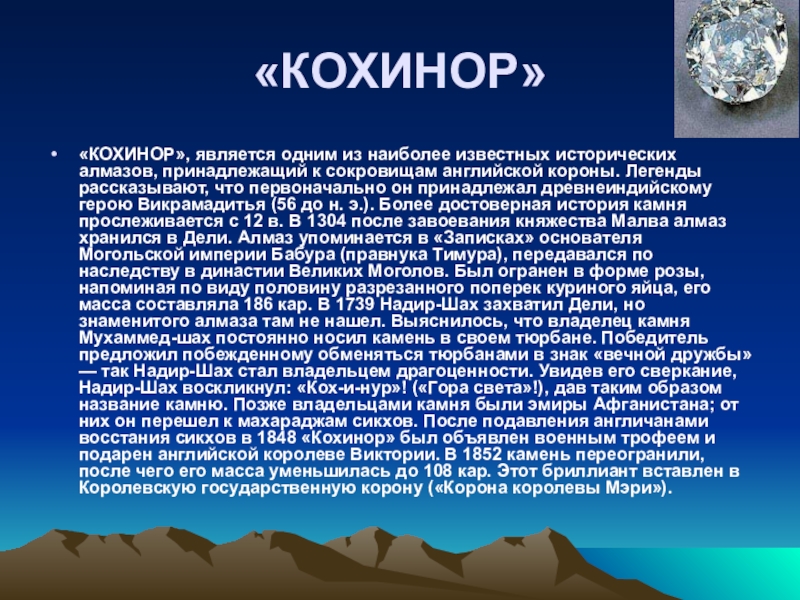 сокровищам английской короны. Легенды рассказывают, что первоначально он принадлежал древнеиндийскому герою Викрамадитья (56 до н. э.). Более достоверная история камня прослеживается с 12 в. В 1304 после завоевания княжества Малва алмаз хранился в Дели. Алмаз упоминается в «Записках» основателя Могольской империи Бабура (правнука Тимура), передавался по наследству в династии Великих Моголов. Был огранен в форме розы, напоминая по виду половину разрезанного поперек куриного яйца, его масса составляла 186 кар. В 1739 Надир-Шах захватил Дели, но знаменитого алмаза там не нашел. Выяснилось, что владелец камня Мухаммед-шах постоянно носил камень в своем тюрбане. Победитель предложил побежденному обменяться тюрбанами в знак «вечной дружбы» — так Надир-Шах стал владельцем драгоценности. Увидев его сверкание, Надир-Шах воскликнул: «Кох-и-нур»! («Гора света»!), дав таким образом название камню. Позже владельцами камня были эмиры Афганистана; от них он перешел к махараджам сикхов. После подавления англичанами восстания сикхов в 1848 «Кохинор» был объявлен военным трофеем и подарен английской королеве Виктории. В 1852 камень переогранили, после чего его масса уменьшилась до 108 кар. Этот бриллиант вставлен в Королевскую государственную корону («Корона королевы Мэри»).