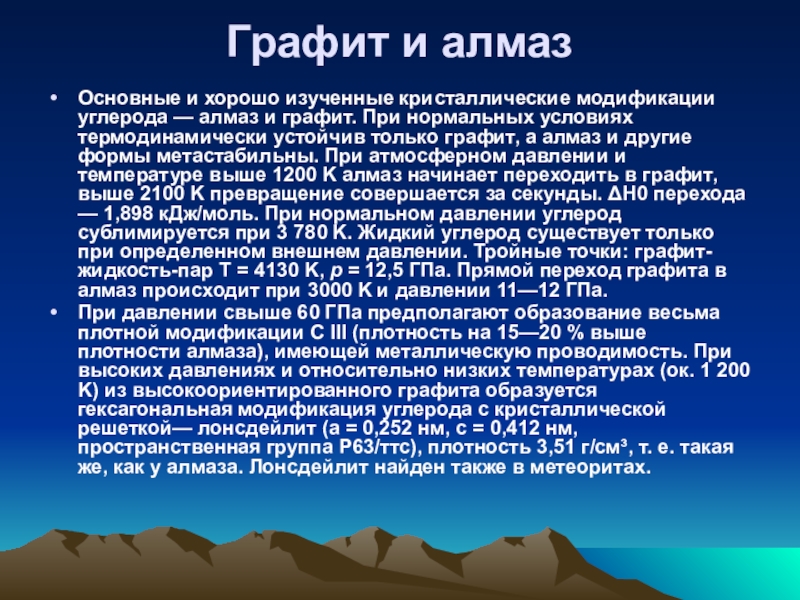 и графит. При нормальных условиях термодинамически устойчив только графит, а алмаз и другие формы метастабильны. При атмосферном давлении и температуре выше 1200 K алмаз начинает переходить в графит, выше 2100 K превращение совершается за секунды. ΔН0 перехода — 1,898 кДж/моль. При нормальном давлении углерод сублимируется при 3 780 K. Жидкий углерод существует только при определенном внешнем давлении. Тройные точки: графит-жидкость-пар Т = 4130 K, р = 12,5 ГПа. Прямой переход графита в алмаз происходит при 3000 K и давлении 11—12 ГПа.