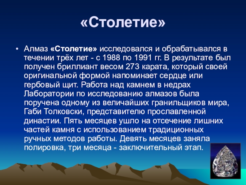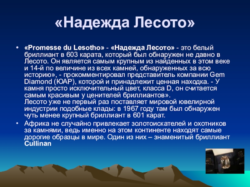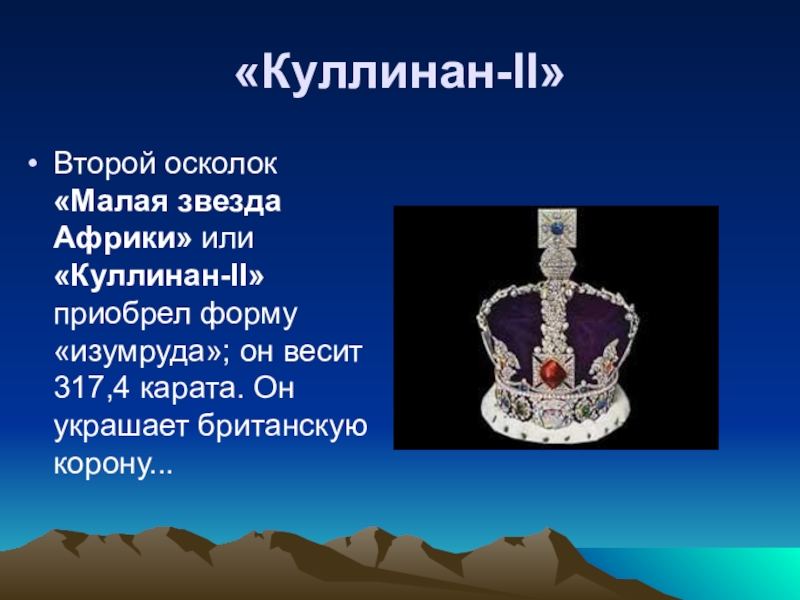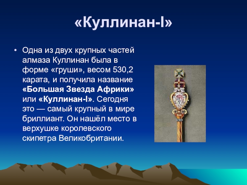 весом 530,2 карата, и получила название «Большая Звезда Африки» или «Куллинан-I». Сегодня это — самый крупный в мире бриллиант. Он нашёл место в верхушке королевского скипетра Великобритании.
