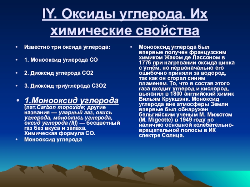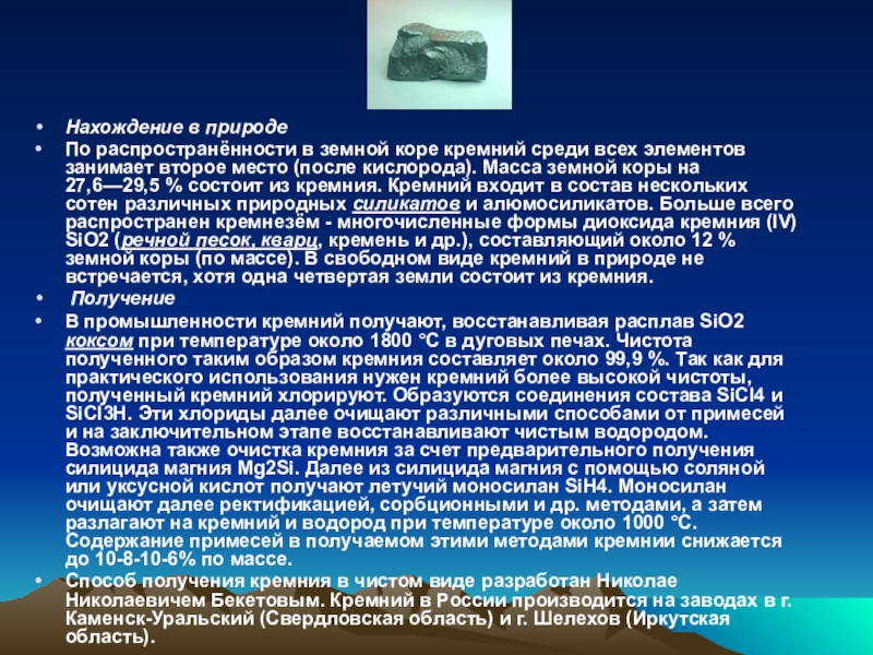 1.Оксид кремния II (моноксид кремния) SiO — смолоподобное аморфное вещество, при обычных условиях устойчиво к действию кислорода. Относится к несолеобразующим оксидам. В природе (на земле) SiO не встречается. Газообразный моноксид кремния обнаружен в газопылевых облаках межзвездных сред и на солнечных пятнах.