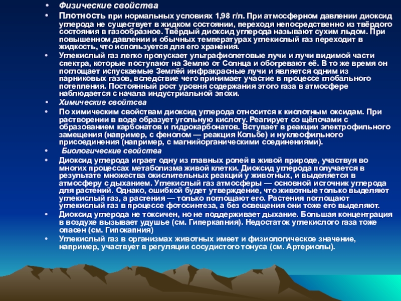 углерода не существует в жидком состоянии, переходя непосредственно из твёрдого состояния в газообразное. Твёрдый диоксид углерода называют сухим льдом. При повышенном давлении и обычных температурах углекислый газ переходит в жидкость, что используется для его хранения.