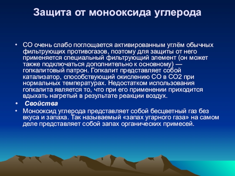 противогазов, поэтому для защиты от него применяется специальный фильтрующий элемент (он может также подключаться дополнительно к основному) — гопкалитовый патрон. Гопкалит представляет собой катализатор, способствующий окислению CO в CO2 при нормальных температурах. Недостатком использования гопкалита является то, что при его применении приходится вдыхать нагретый в результате реакции воздух.