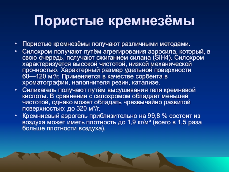 в свою очередь, получают сжиганием силана (SiH4). Силохром характеризуется высокой чистотой, низкой механической прочностью. Характерный размер удельной поверхности 60—120 м²/г. Применяется в качестве сорбента в хроматографии, наполнителя резин, катализе.