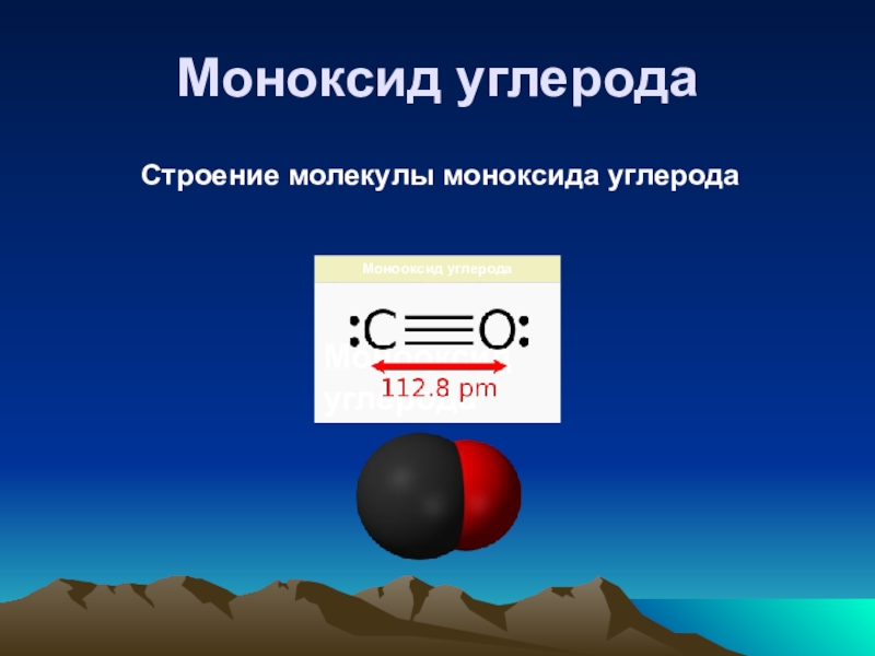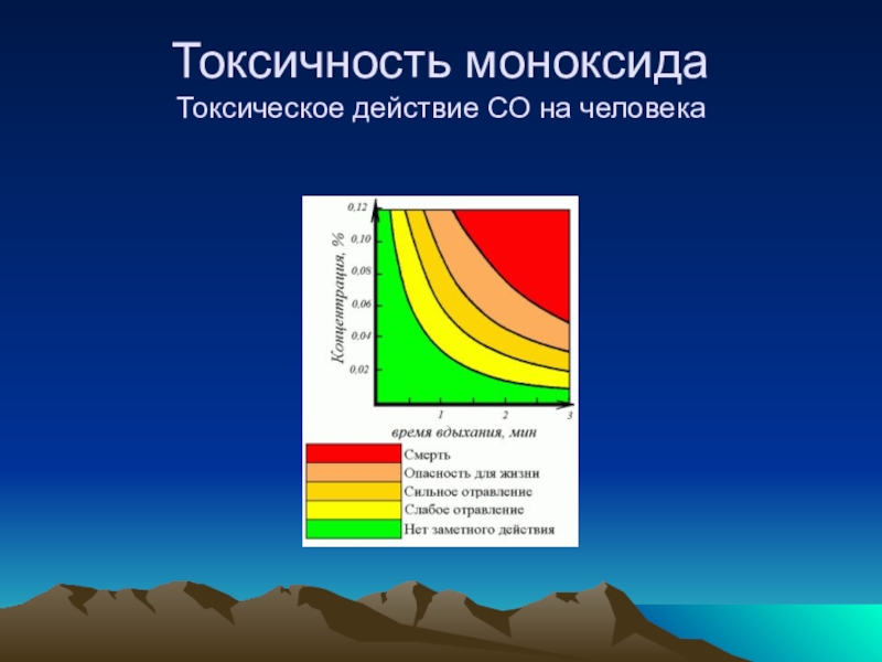 имеет запаха и вызывает отравление и даже смерть. Признаками отравления служат головная боль, головокружение и потеря сознания. Токсическое действие монооксида углерода основано на том, что он связывается с гемоглобином крови прочнее, чем кислород (при этом образуется карбоксигемоглобин), таким образом, блокируя процессы транспортировки кислорода и клеточного дыхания. Предельно допустимая концентрация монооксида углерода в воздухе промышленных предприятий составляет 0,02 мг/л. Концентрация более 0,1 % — смертельна. В выхлопе бензинового автомобиля допускается до 1,5-3 %.