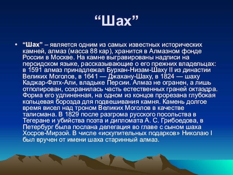 88 кар), хранится в Алмазном фонде России в Москве. На камне выгравированы надписи на персидском языке, рассказывающие о его прежних владельцах: в 1591 алмаз принадлежал Бурхан-Низам-Шаху II из династии Великих Моголов, в 1641 — Джахану-Шаху, в 1824 — шаху Каджар-Фатх-Али, владыке Персии. Алмаз не огранен, а лишь отполирован, сохранилась часть естественных граней октаэдра. Форма его удлиненная, на одном из концов прорезана глубокая кольцевая борозда для подвешивания камня. Камень долгое время висел над троном Великих Моголов в качестве талисмана. В 1829 после разгрома русского посольства в Тегеране и убийства поэта и дипломата А. С. Грибоедова, в Петербург была послана делегация во главе с сыном шаха Хосров-Мирзой. В числе «искупительных подарков» Николаю I был вручен от имени шаха старинный алмаз.