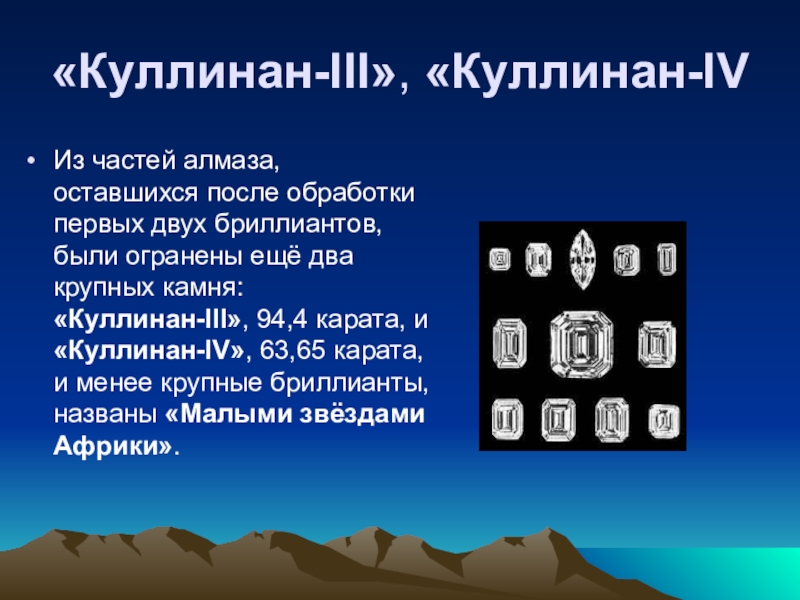 огранены ещё два крупных камня: «Куллинан-III», 94,4 карата, и «Куллинан-IV», 63,65 карата, и менее крупные бриллианты, названы «Малыми звёздами Африки».