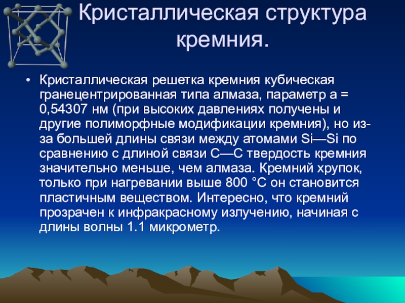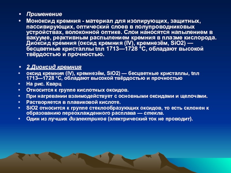 полупроводниковых устройствах, волоконной оптике. Слои наносятся напылением в вакууме, реактивным распылением кремния в плазме кислорода. Диокси́д кре́мния (оксид кремния (IV), кремнезём, SiO2) — бесцветные кристаллы tпл 1713—1728 °C, обладают высокой твёрдостью и прочностью.