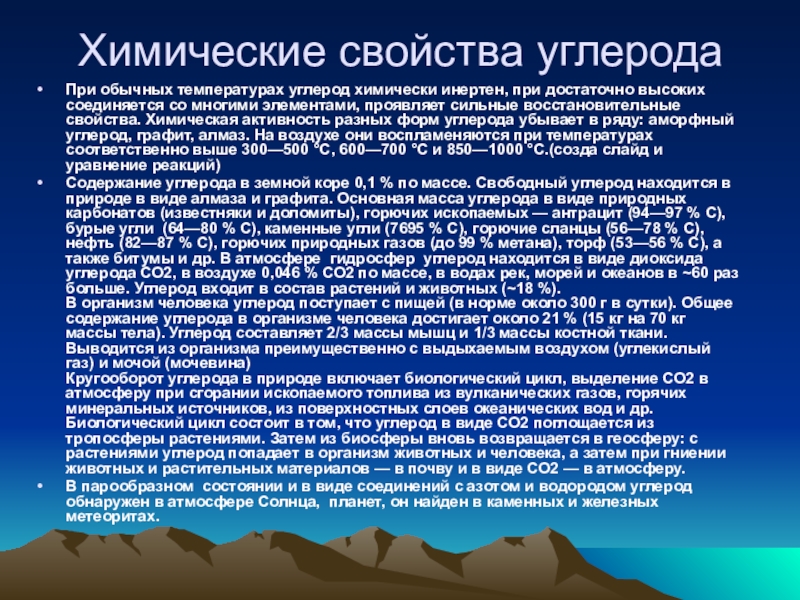 Содержание углерода в земной коре 0,1 % по массе. Свободный углерод находится в природе в виде алмаза и графита. Основная масса углерода в виде природных карбонатов (известняки и доломиты), горючих ископаемых — антрацит (94—97 % С), бурые угли (64—80 % С), каменные угли (7695 % С), горючие сланцы (56—78 % С), нефть (82—87 % С), горючих природных газов (до 99 % метана), торф (53—56 % С), а также битумы и др. В атмосфере гидросфер углерод находится в виде диоксида углерода СО2, в воздухе 0,046 % СО2 по массе, в водах рек, морей и океанов в ~60 раз больше. Углерод входит в состав растений и животных (~18 %).