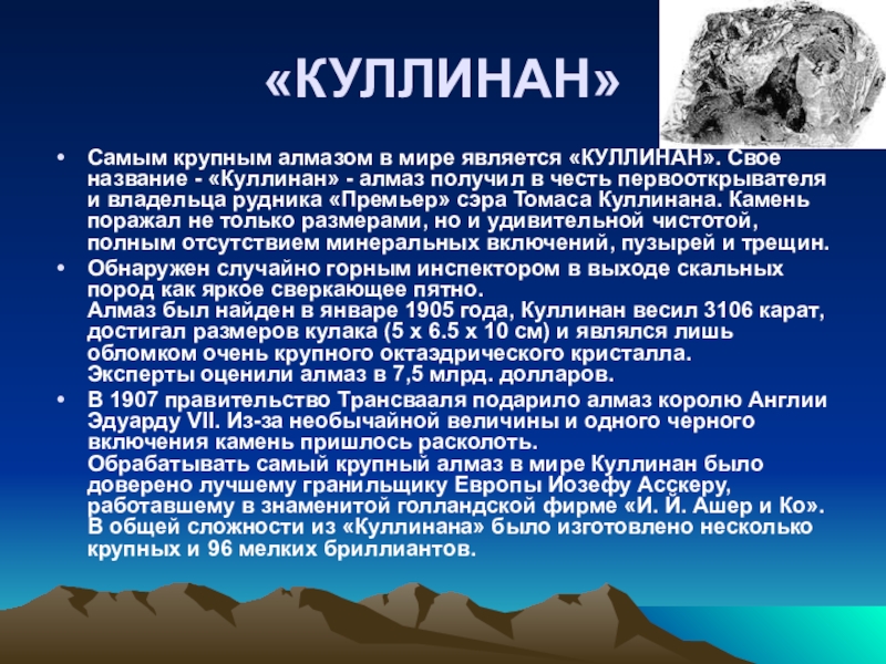 Самым крупным алмазом в мире является «КУЛЛИНАН». Свое название - «Куллинан»