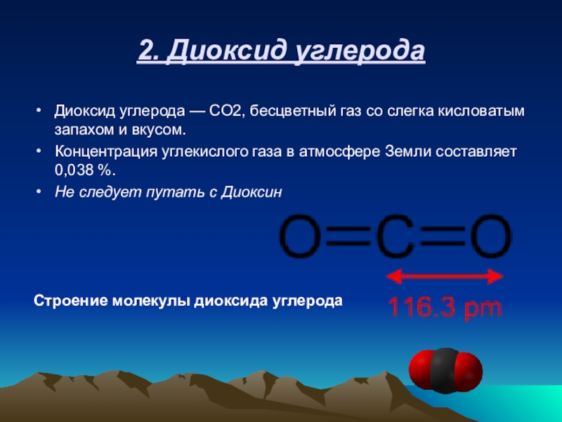 Диоксид углерода — CO2, бесцветный газ со слегка кисловатым запахом