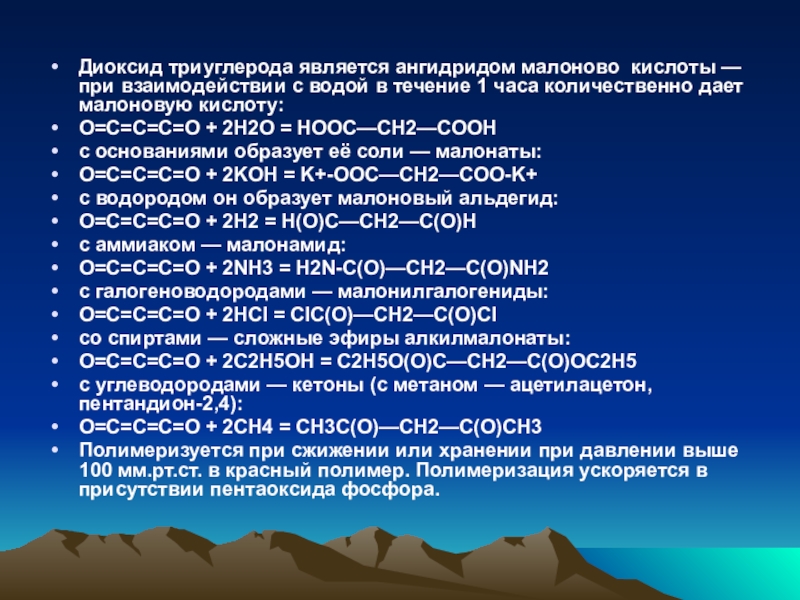 Слайд 48Диоксид триуглерода является ангидридом малоново кислоты — при взаимодействии с водой в