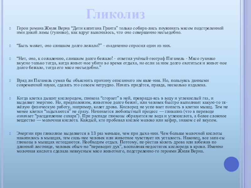 “Нет, оно, к сожалению, слишком долго бежало! - ответил учёный-географ Паганель - Мясо гуанако вкусно только тогда, когда живот-ное убито во время отдыха, но если за ним долго охотиться и живот-ное долго бежало, тогда его мясо несъедобно.”