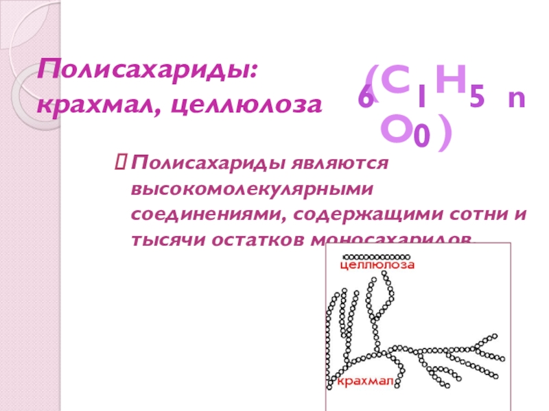 Полисахариды: крахмал, целлюлозаПолисахариды являются высокомолекулярными соединениями, содержащими сотни и тысячи остатков моносахаридов.