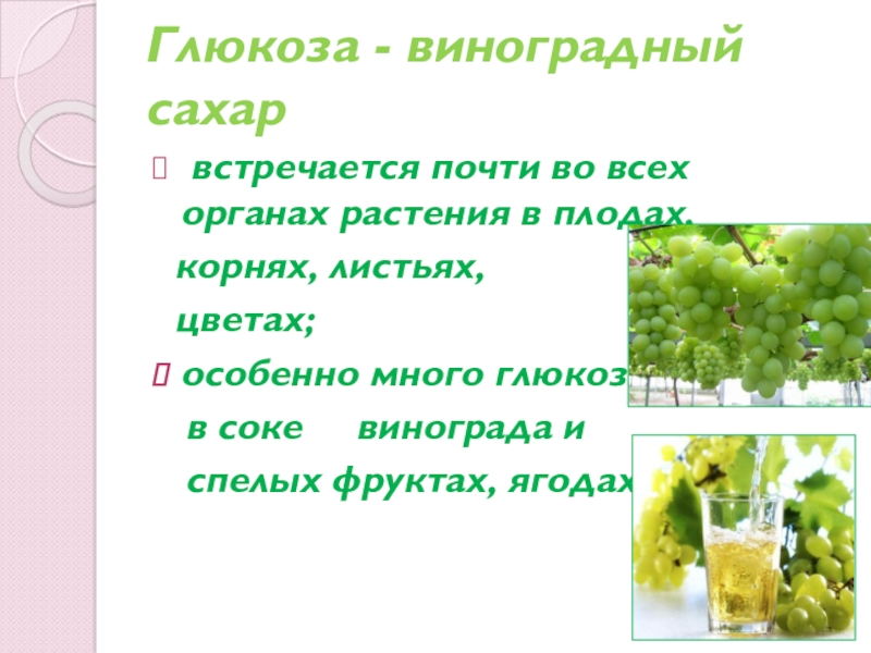 Глюкоза - виноградный сахар встречается почти во всех органах растения в плодах,  корнях, листьях,  цветах; особенно