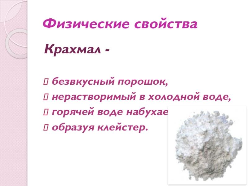 Физические свойстваКрахмал - безвкусный порошок, нерастворимый в холодной воде,горячей воде набухает, образуя клейстер.