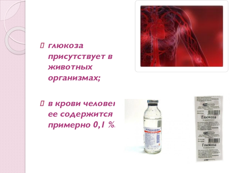 глюкоза присутствует в животных организмах;в крови человека ее содержится примерно 0,1 %.