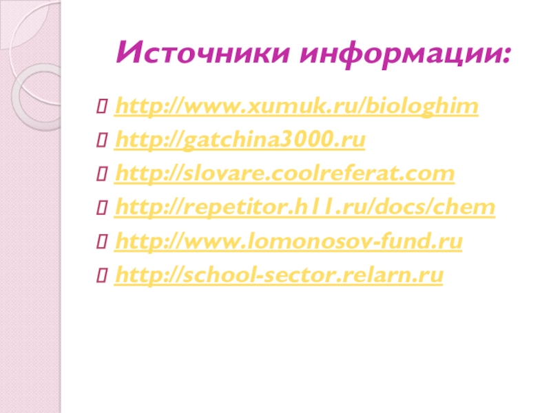 Источники информации:http://www.xumuk.ru/biologhimhttp://gatchina3000.ruhttp://slovare.coolreferat.comhttp://repetitor.h11.ru/docs/chemhttp://www.lomonosov-fund.ruhttp://school-sector.relarn.ru