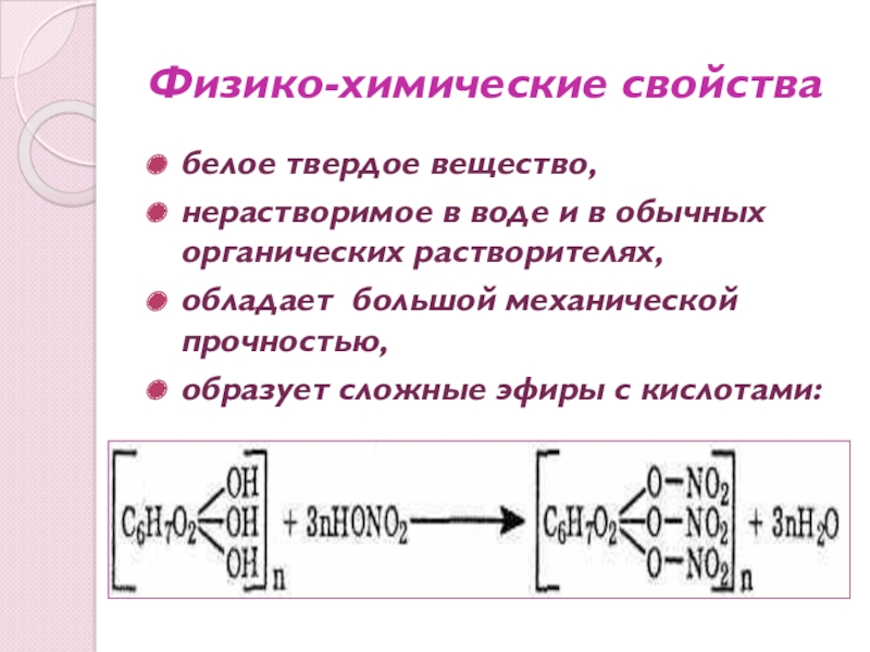 Физико-химические свойствабелое твердое вещество, нерастворимое в воде и в обычных органических растворителях,обладает большой механической прочностью,образует сложные эфиры