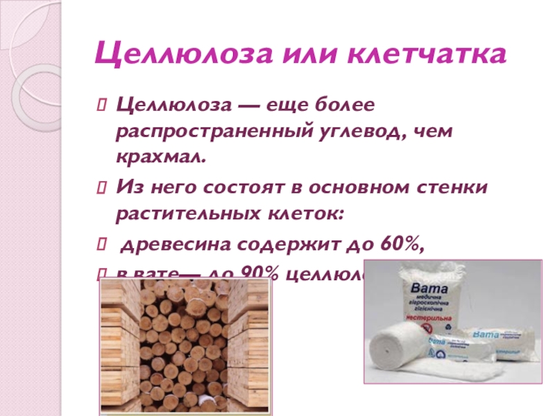 Целлюлоза или клетчаткаЦеллюлоза — еще более распространенный углевод, чем крахмал. Из него состоят в основном стенки растительных
