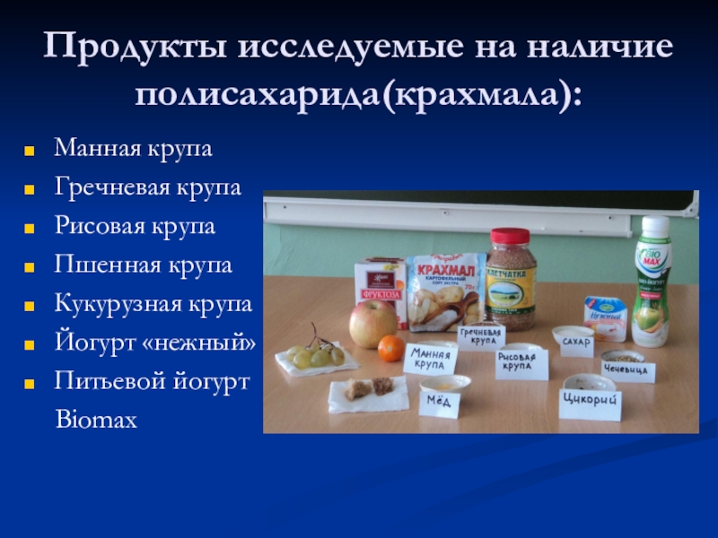 Слайд 23Продукты исследуемые на наличие полисахарида(крахмала):