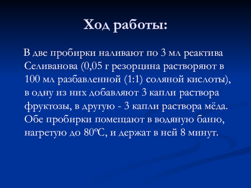 Селиванова (0,05 г резорцина растворяют в 100 мл разбавленной (1:1) соляной кислоты), в одну из них добавляют 3 капли раствора фруктозы, в другую - 3 капли раствора мёда. Обе пробирки помещают в водяную баню, нагретую до 80ºС, и держат в ней 8 минут.