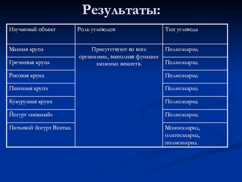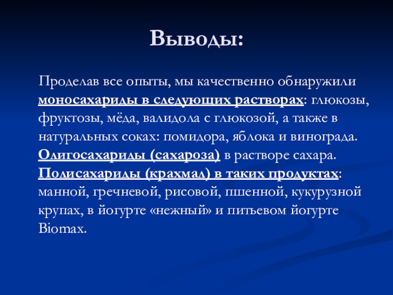 растворах: глюкозы, фруктозы, мёда, валидола с глюкозой, а также в натуральных соках: помидора, яблока и винограда. Олигосахариды (сахароза) в растворе сахара. Полисахариды (крахмал) в таких продуктах: манной, гречневой, рисовой, пшенной, кукурузной крупах, в йогурте «нежный» и питьевом йогурте Biomax.