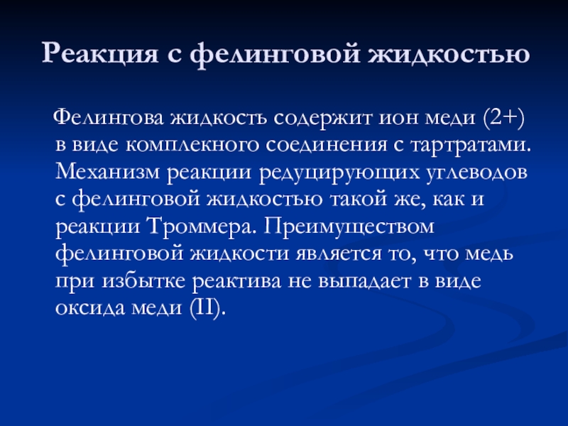 в виде комплекного соединения с тартратами. Механизм реакции редуцирующих углеводов с фелинговой жидкостью такой же, как и реакции Троммера. Преимуществом фелинговой жидкости является то, что медь при избытке реактива не выпадает в виде оксида меди (II).