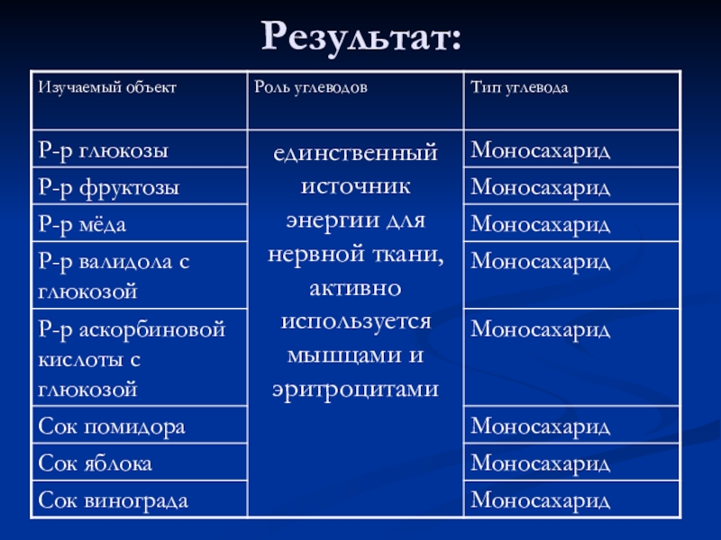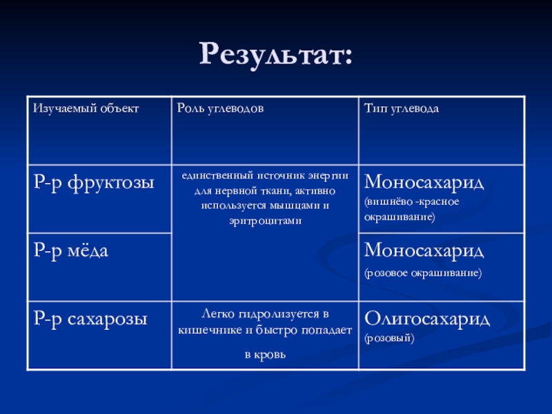Проделав все опыты, мы качественно обнаружили моносахариды в следующих