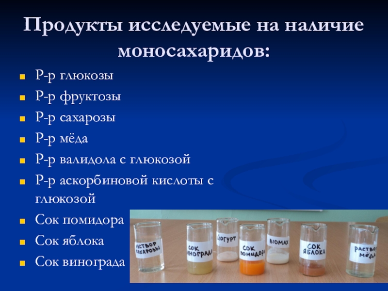 Слайд 14Продукты исследуемые на наличие моносахаридов: