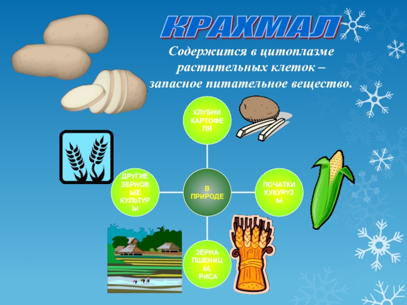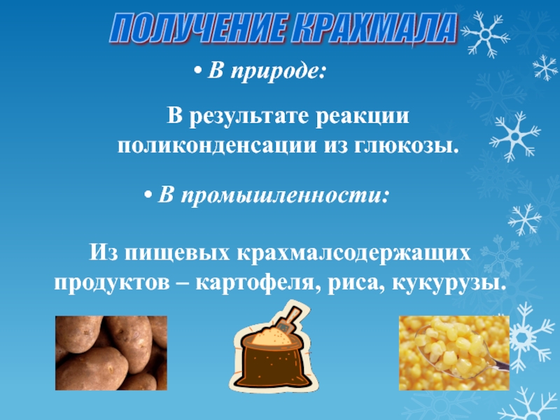 Из пищевых крахмалсодержащих продуктов – картофеля, риса, кукурузы.