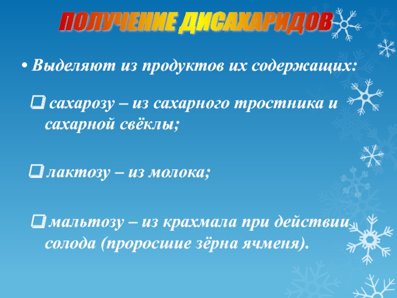 мальтозу – из крахмала при действии солода (проросшие зёрна ячменя).