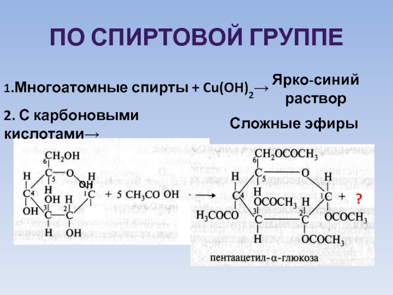 ПО СПИРТОВОЙ ГРУППЕ1.Многоатомные спирты + Cu(OH)2→Ярко-синий раствор2. С карбоновыми кислотами→Сложные эфирыОН?