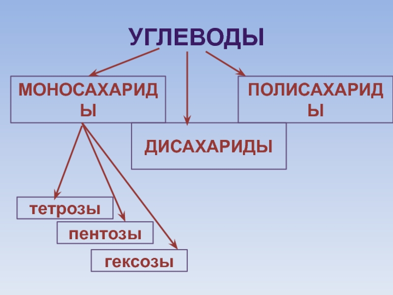 УГЛЕВОДЫ МОНОСАХАРИДЫДИСАХАРИДЫПОЛИСАХАРИДЫтетрозыпентозыгексозы