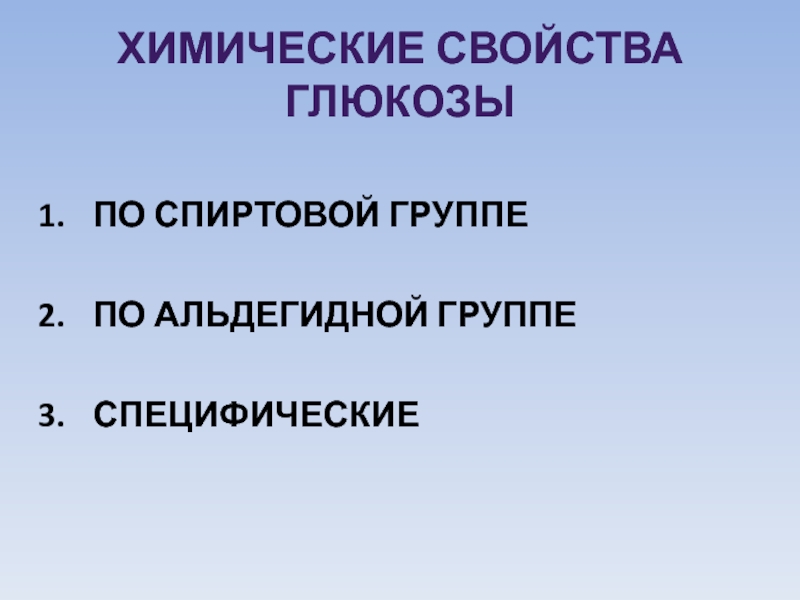 ХИМИЧЕСКИЕ СВОЙСТВА ГЛЮКОЗЫПО СПИРТОВОЙ ГРУППЕПО АЛЬДЕГИДНОЙ ГРУППЕСПЕЦИФИЧЕСКИЕ