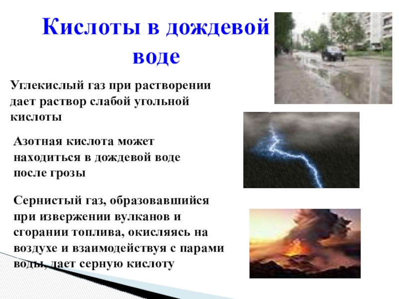 Сернистый газ, образовавшийся при извержении вулканов и сгорании топлива, окисляясь на воздухе и взаимодействуя с парами воды, дает серную кислоту