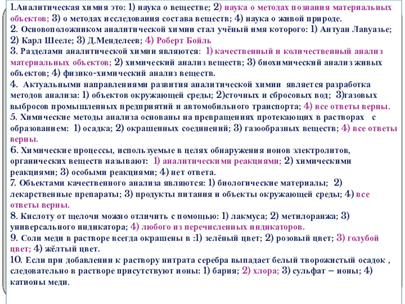 2. Основоположником аналитической химии стал учёный имя которого: 1) Антуан Лавуазье; 2) Карл Шееле; 3) Д.Менделеев; 4) Роберт Бойль