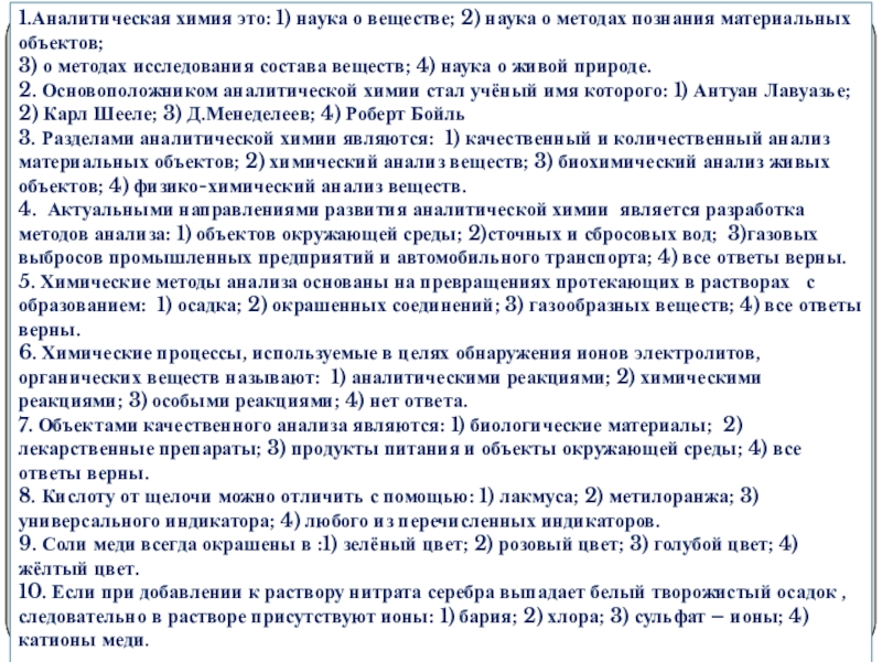 Слайд 191.Аналитическая химия это: 1) наука о веществе; 2) наука о методах